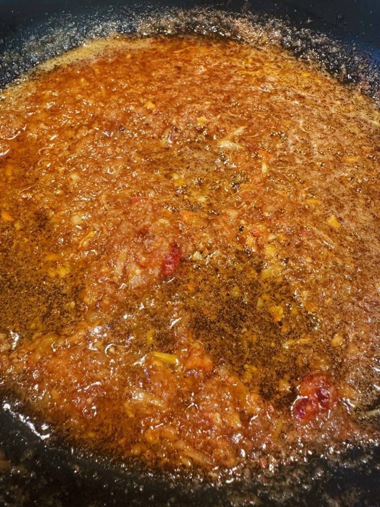 9.爆香後加入蝦頭糕,以慢火慢慢煮,直至蝦油冒出