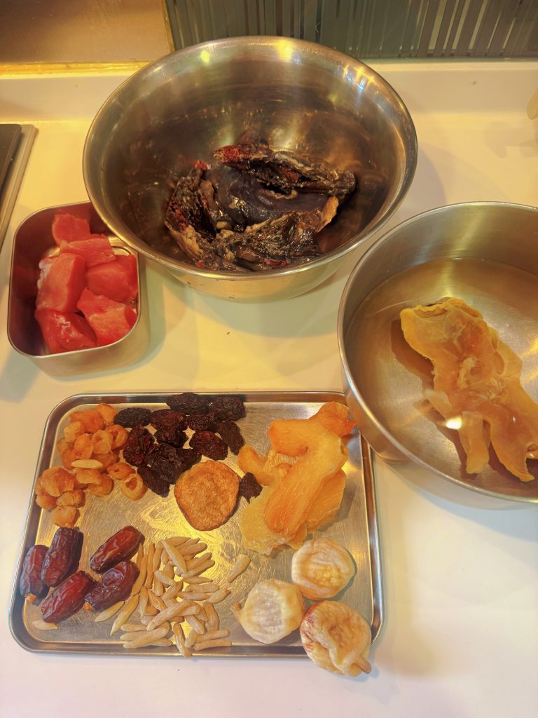 材料A: 麥冬20克、圓肉30克、南棗40克、椰棗40克、果皮一塊、無花果XL三粒、乾螺頭(XL) 一隻、烏雞一隻、瘦肉半斤、瑤柱兩粒