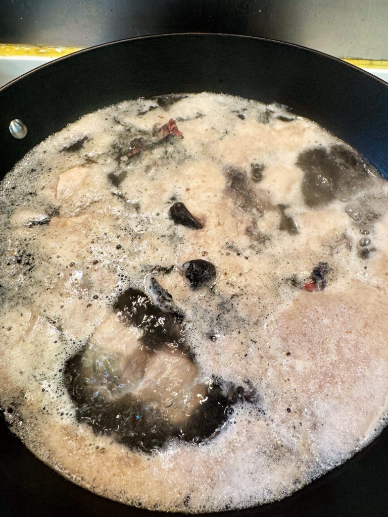 2烏雞起皮及切件、瘦肉切大粒,放在室溫水中加熱後取出,洗淨備用