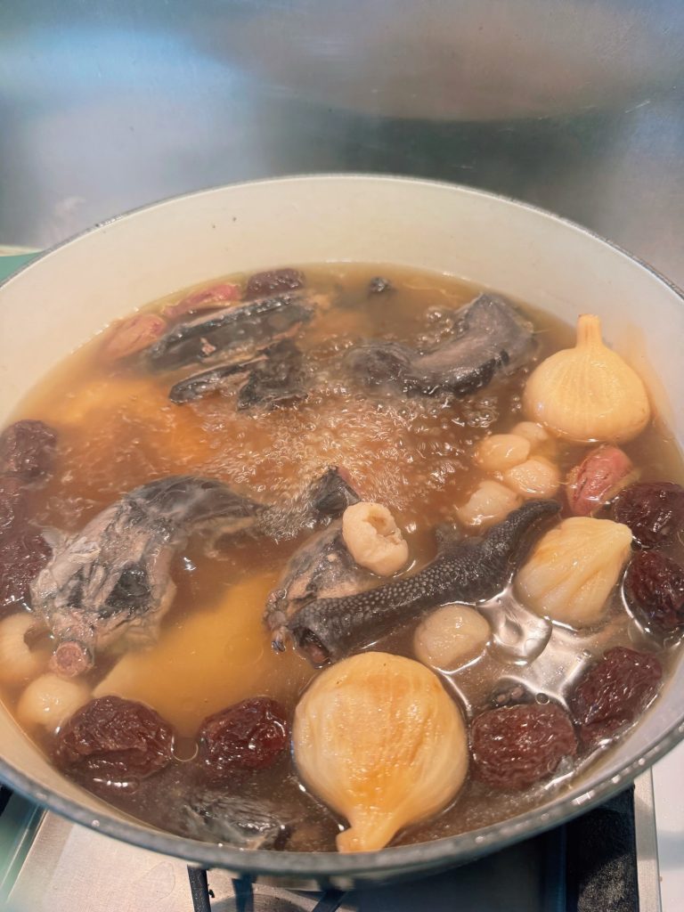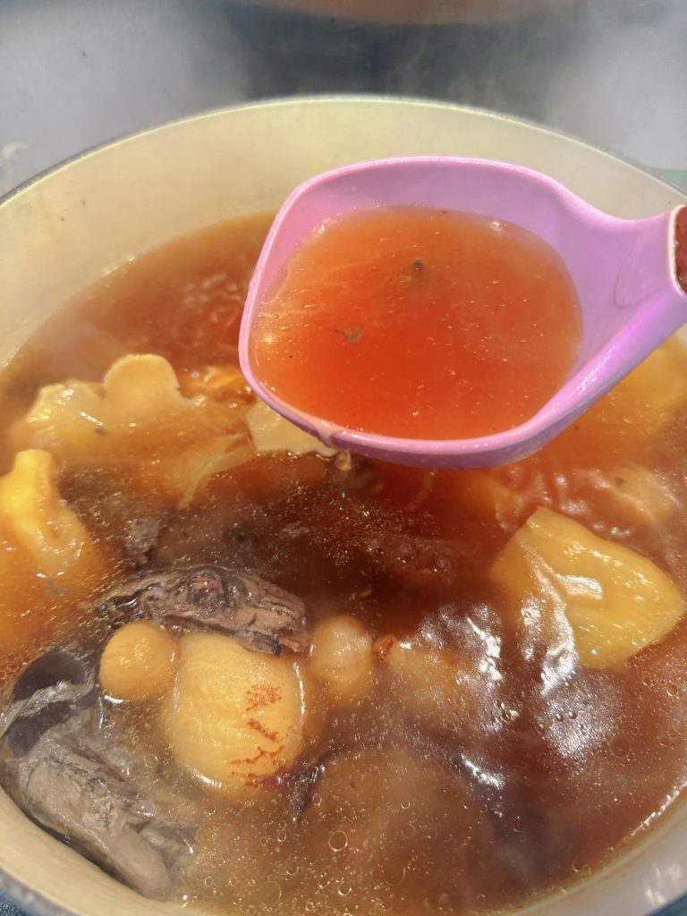 5.在鍋中加入4.5公升及浸螺的水的水,煮滾然後把材料A放進,大火煮滾,然後以中小火煮1小時15分鐘
