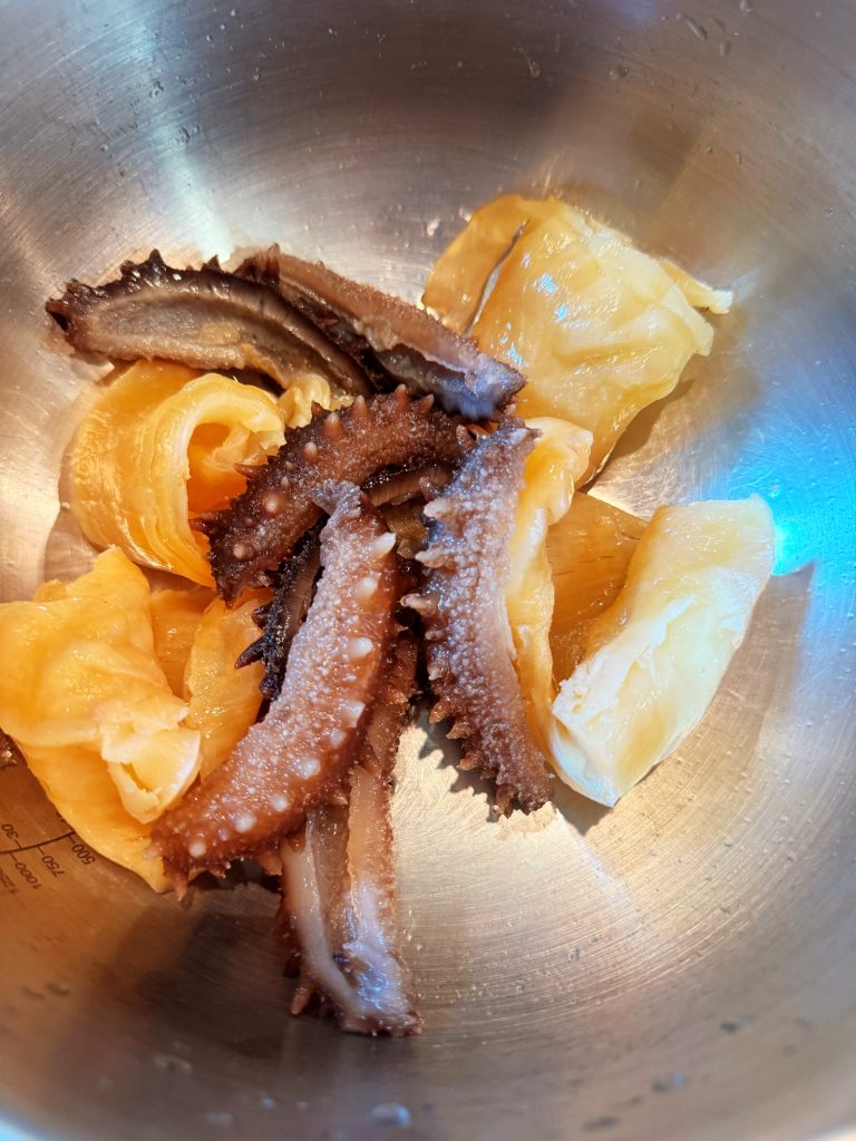 材料B:已浸發花膠兩隻(一隻剪開兩隻)、已浸法海參四條(可按喜好加減)