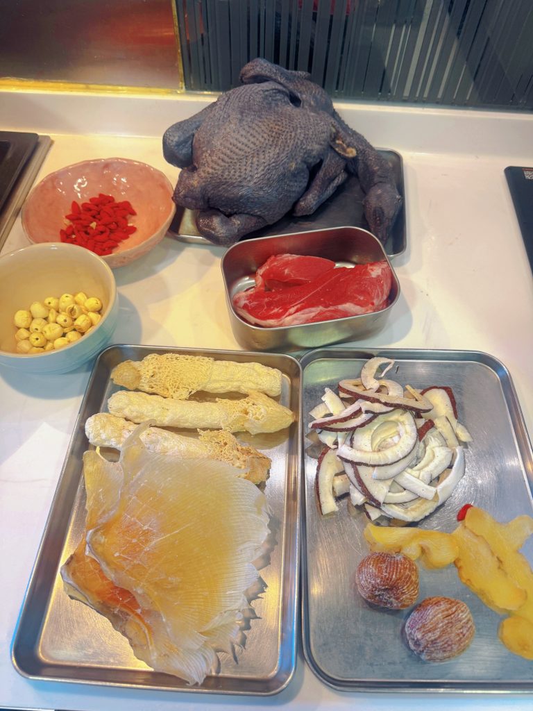 材料:雪鳳凰一隻(斬件去皮)、蒲魚翅湯包(包括三粒蜜棗、海底玉竹25克、白蓮子40克、野生竹笙三條、杞子15克)、海底椰子一個(切片)、豬展半斤、瑤柱兩粒