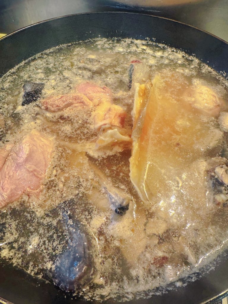 1.雪鳳凰斬件去皮,豬展切開幾件,放在室溫水中煮滾,取出洗乾淨