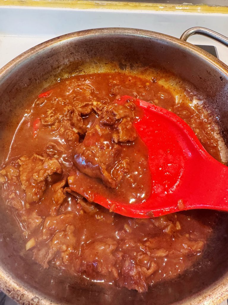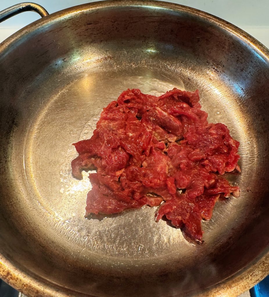 4.在鍋中加入適量的油,爆香牛肉,直至九成熟,然後取出備用