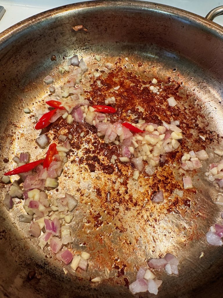 5.在同一個鑊中加入適量的油,爆香蒜頭、蔥頭及指天椒直至香起四溢