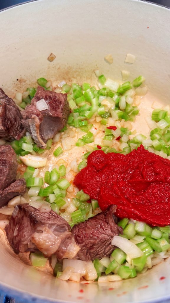 材料:牛腩半斤、椰菜一個、甘筍一條(今日唔記得咗買冇落到)、蕃茄六個、茄膏五湯匙、指天椒兩條(今日走辣冇落到)、西芹兩至三條、蒜頭四至五粒,水2公升、香葉6塊、青檸兩個(取汁用)