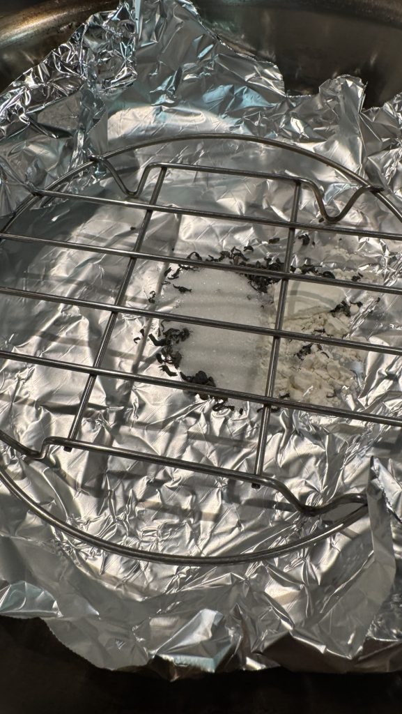 4. 在不鏽鋼鍋中或者鑄鐵鍋中放上一張錫紙,把煙燻材料放在錫紙上拌勻,然後放上一個蒸架