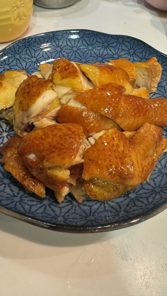 2.雞煮前30至45分鐘在雪櫃中取出回溫,放在蒸爐中以38分鐘蒸熟,或者放在鑊中以滾水蒸熟(大約30分鐘,視乎雞的大小,我的雞大約是兩斤左右)
