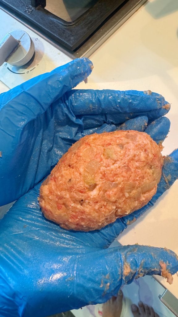 兩隻手帶上手套,取出漢堡扒,然後左右手交替撻最少20次,把漢堡扒造成橢圓形,放在已鋪上保鮮紙的碟上