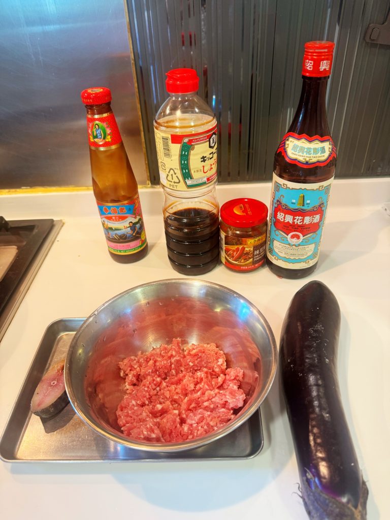 材料:茄子大size一個、豬肉200克(剁碎)、鹹魚一小塊、肉薑兩片、蒜頭兩至三粒、紅蔥頭一粒(去皮後一開四)