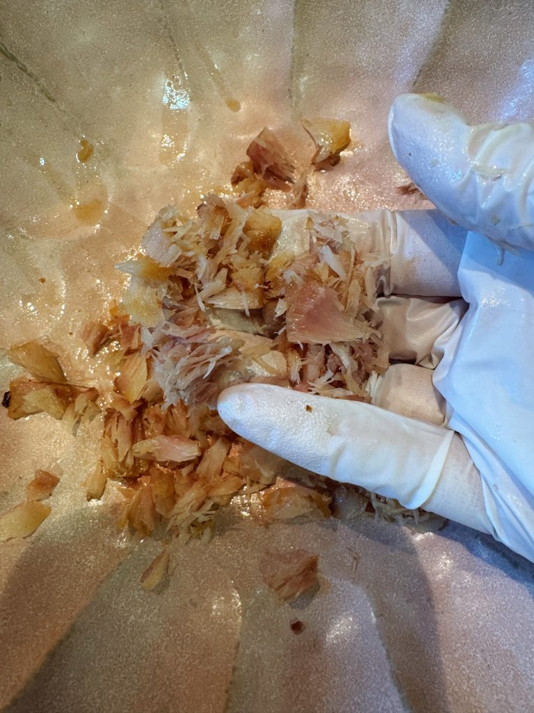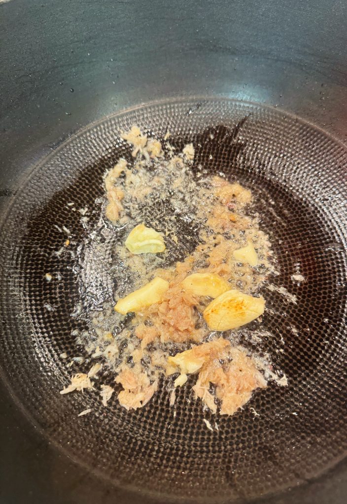 1.在平底鑊加入少許油,煎香鹹魚後取出,放涼後去骨備用