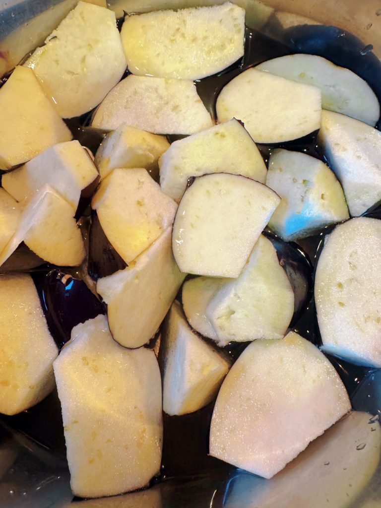 4.茄子洗乾淨後以滾筒切件,放在鹽水中