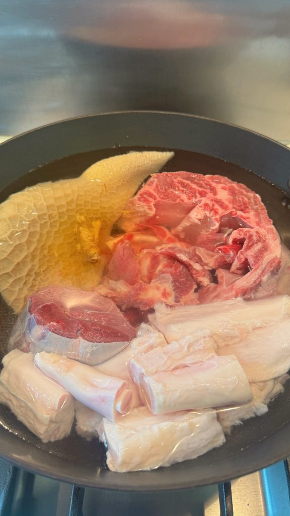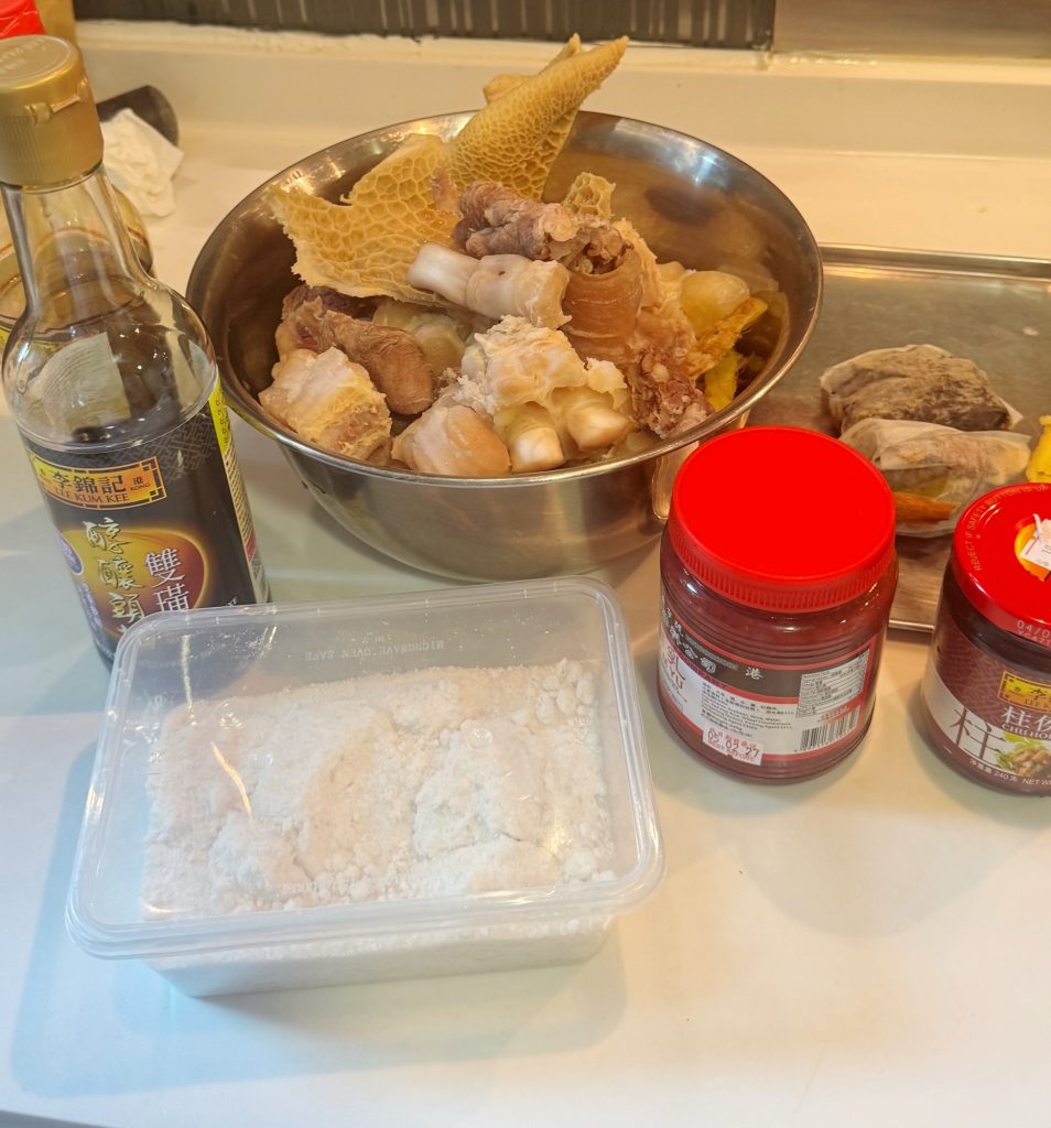 材料:金錢展一個、牛筋一斤、牛坑腩一斤、金錢肚半斤、牛筋腩半斤、薑一大塊(拍扁)、蔥頭四粒、蒜頭四至五粒、白醋一湯匙