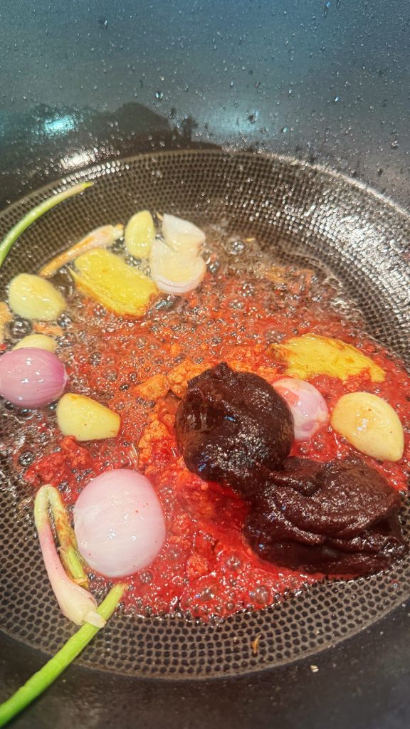 2. 炒鍋洗乾淨後注入少量油,爆香薑、蔥頭及蒜頭,加入醬汁材料一爆香