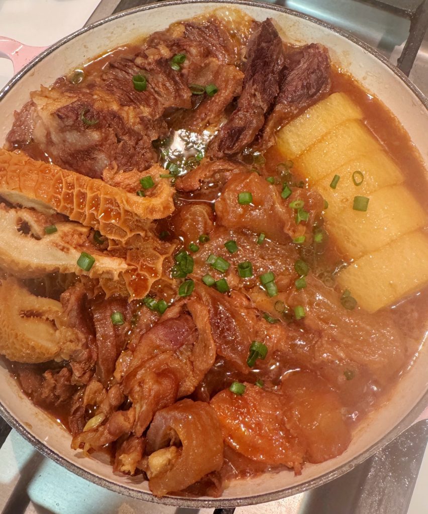 材料:金錢展一個、牛筋一斤、牛坑腩一斤、金錢肚半斤、牛筋腩半斤、薑一大塊(拍扁)、蔥頭四粒、蒜頭四至五粒、白醋一湯匙