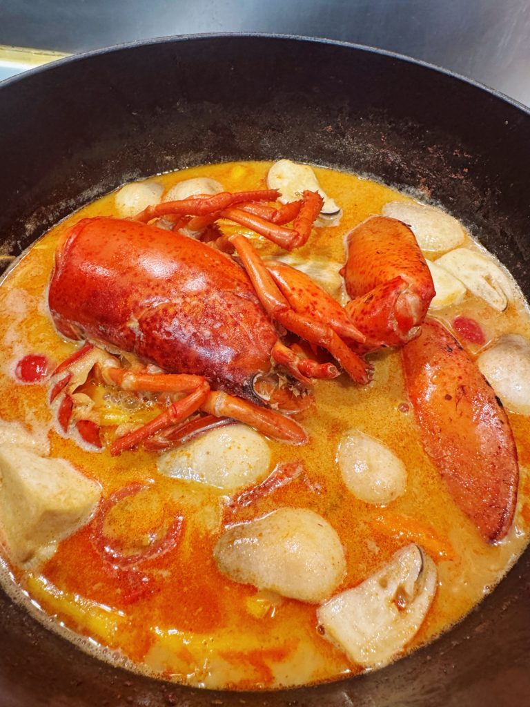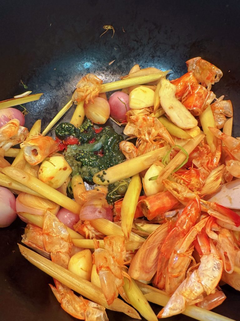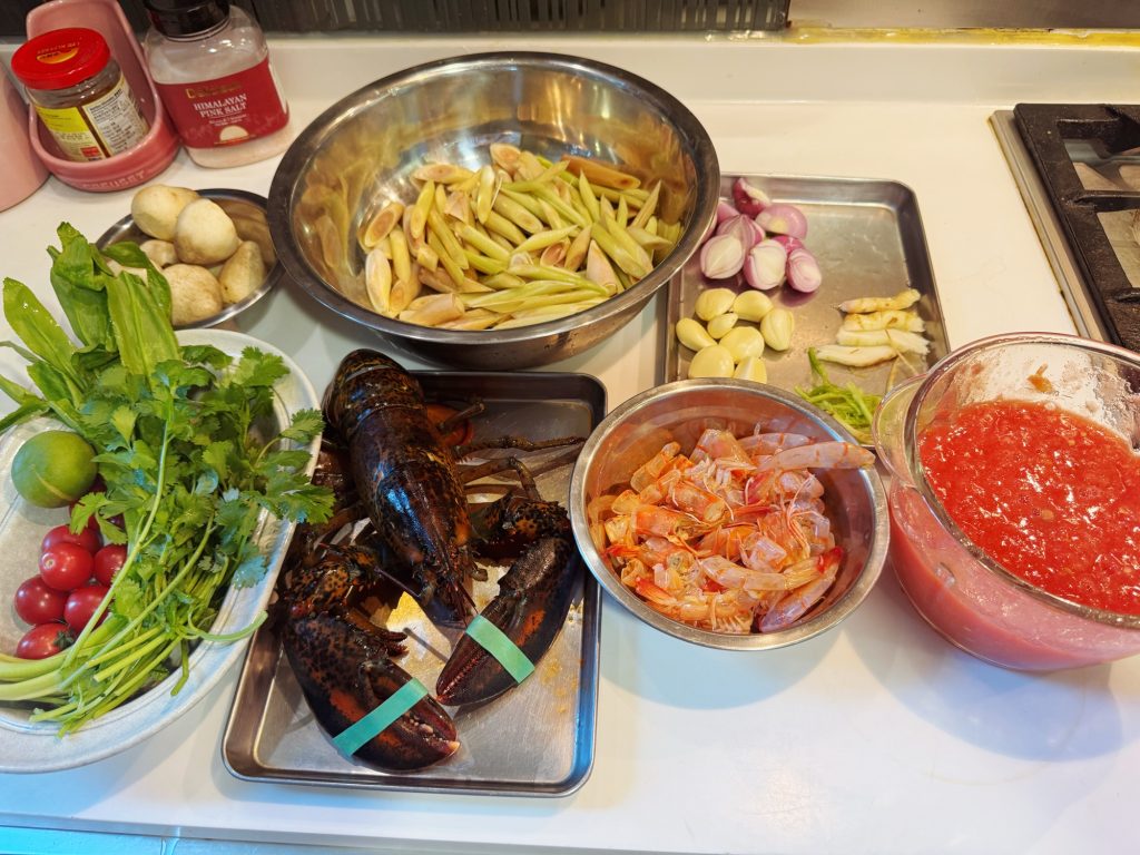 材料:香茅10至12支、南薑四至五片、蕃茄三個、芫荽根8至10條、雞湯一公升(我用自製嘅雞湯)、蒜頭8至10粒、蔥頭6-8粒(一開二)、檸檬葉四至五塊、泰國芫荽適量、芫荽適量、蝦殼半斤、龍蝦一隻、車厘茄及草菇(一開二)適量、椰汁300毫升(按喜好加減)、指天椒適量、青檸三至四個(取青檸汁用)
