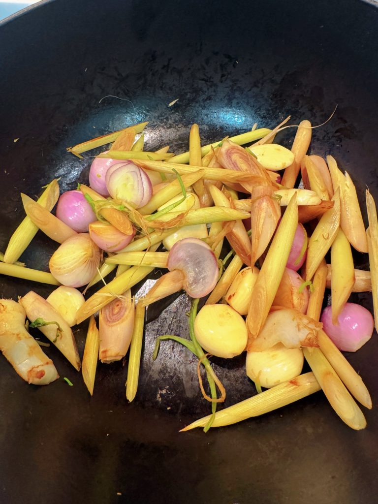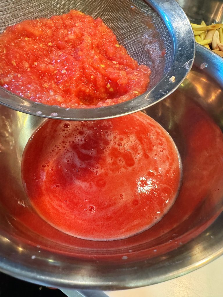 1. 香茅取根部位置切片、芫荽根洗乾淨、南薑切片、蕃茄去除外皮後以攪拌器攪成蕃茄汁
